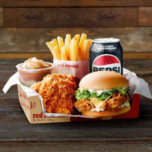 Burger or Hotdog combo meal with fried chicken, french fries/chips, sauce, and drink | Same Day or Next Day delivery